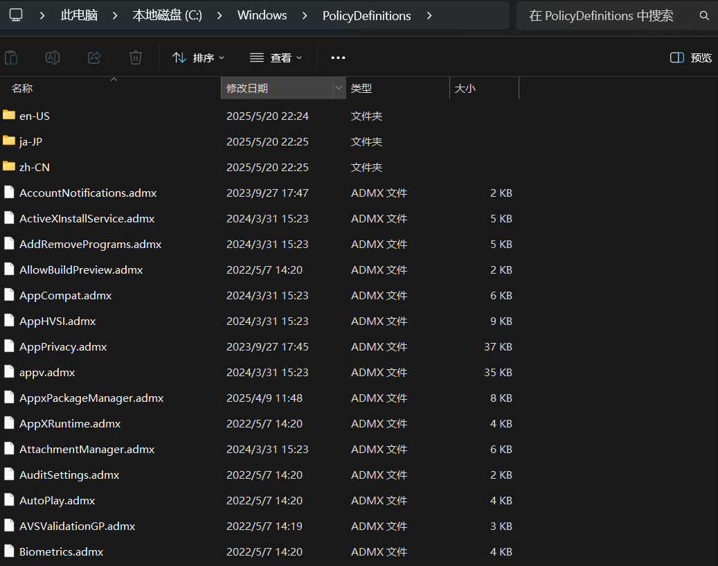 「%systemroot%\PolicyDefinitions」文件夹里是你已安装的所有语言所对应的文件,下面我们以简体中文来举例说明