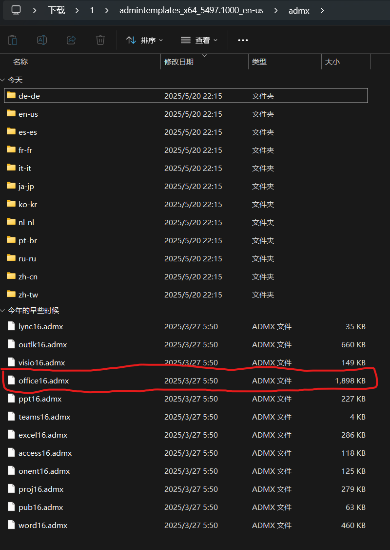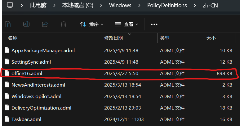 5.将解压好的文件夹中的「\admx\zh-cn\office16.adml」复制到「%systemroot%\PolicyDefinitions\zh-CN」里,其他语言同理。