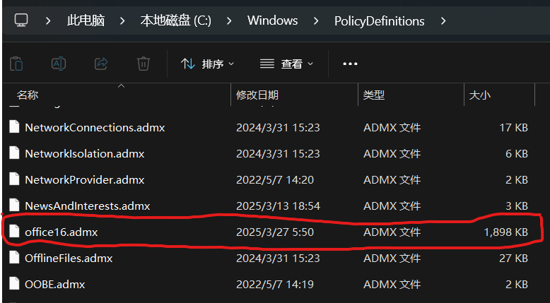 4.将解压后文件夹中「\admx\office16.admx」的文件直接复制到「%systemroot%\PolicyDefinitions」里