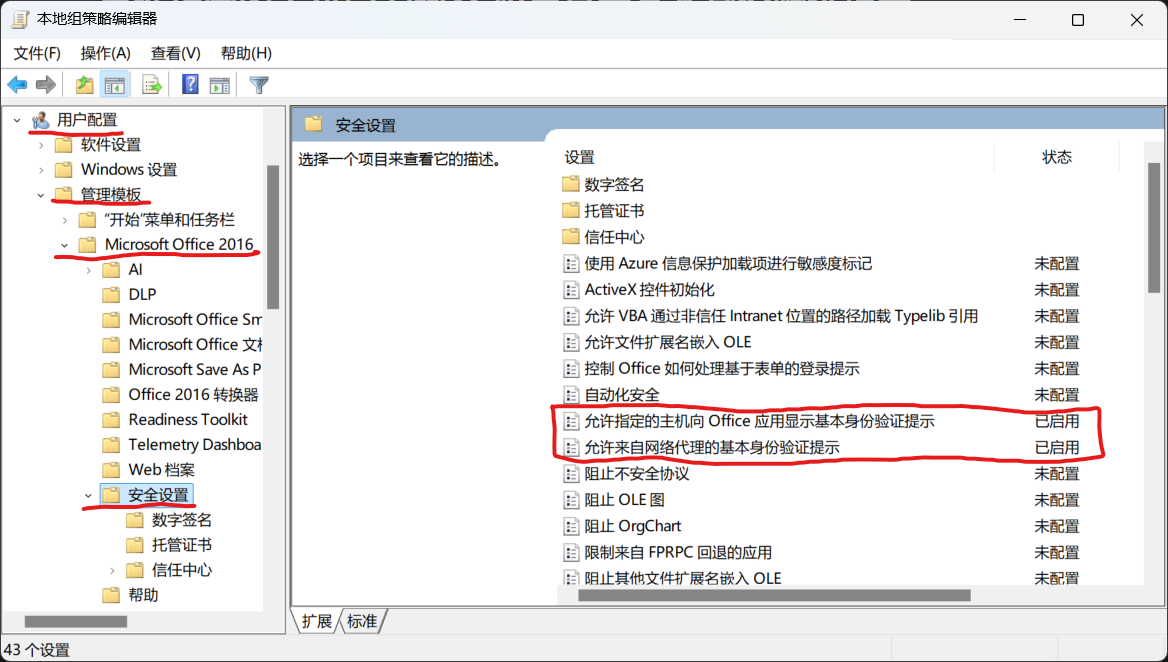 「允许指定的主机向 Office 应用显示基本身份验证提示」和「允许来自网络代理的基本身份验证提示」这两项设置。