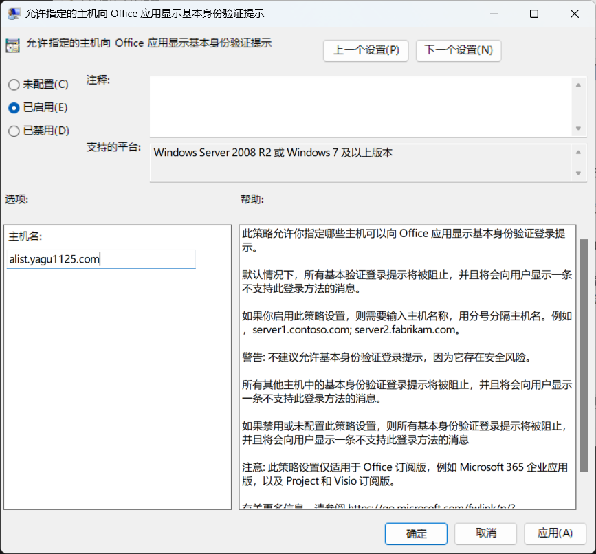 7.这两项设置默认为未配置状态,我们要做的是将两项设置都改成启用,并在「允许指定的主机向 Office 应用显示基本身份验证提示」按照指示输入主机名(域名)并用分号分隔。点击「应用」保存后就可以解决了。