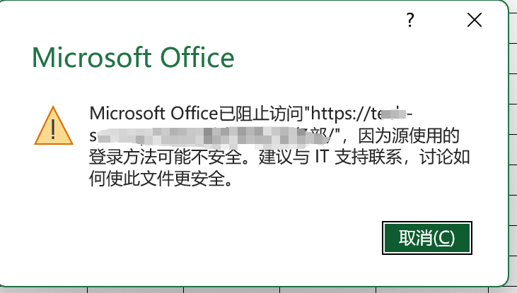 在Windows系统中,PDF,VSCode等文件都可以在网络畅通时像本地文件一样无缝访问。但Office文件(Excel,PowerPoint,Word等)会在打开时显示「已阻止访问’xxxx’,因为源使用的登录方法可能不安全。建议与IT 支持联系,讨论如何使此文件更安全。」